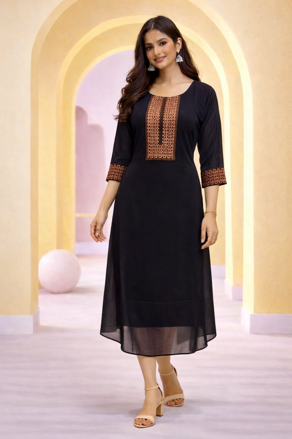 Stylish A-line gown crafted from soft georgette fabric, featuring elegant neck embroidery for a refined and graceful look. Designed with a flowy silhouette and comfortable fit, making it perfect for casual outings, office wear, and festive occasions.