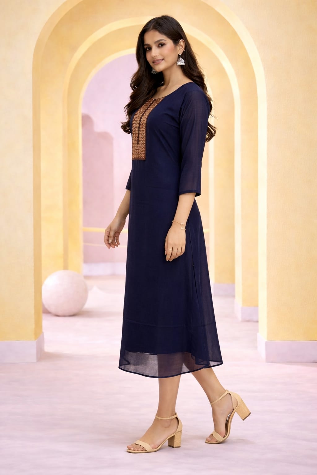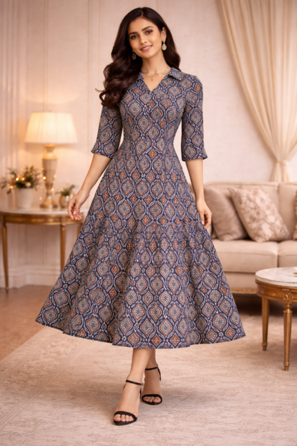 Designed for both comfort and style, the A-line silhouette ensures a relaxed yet flattering fit for all body types. The minimal design combined with intricate neck detailing makes it a versatile addition to your wardrobe. Whether styled for a day event or an evening outing, it brings together comfort, grace, and understated elegance.
